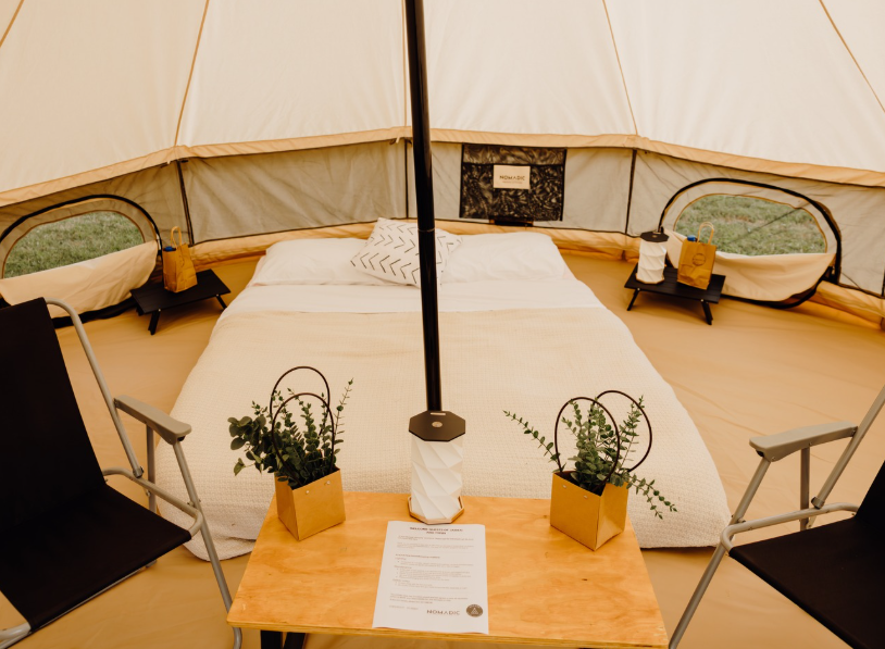 GLAMPING - Foam mattress (es), 2x side table, 2 pillows, 2 chairs/ stools, full hire linen quality sheet sets, bedding arrangements, 2 pillow cases, pole light, 2 x candle/gas/electric lantern, 2 x chairs/stools, 1 display unit,  floor rug, 2 x solar garden lights, small faux plant arrangement, complimentary waters and comfort items, shower gel, wipes, ear plugs.  - note, no towels provided.