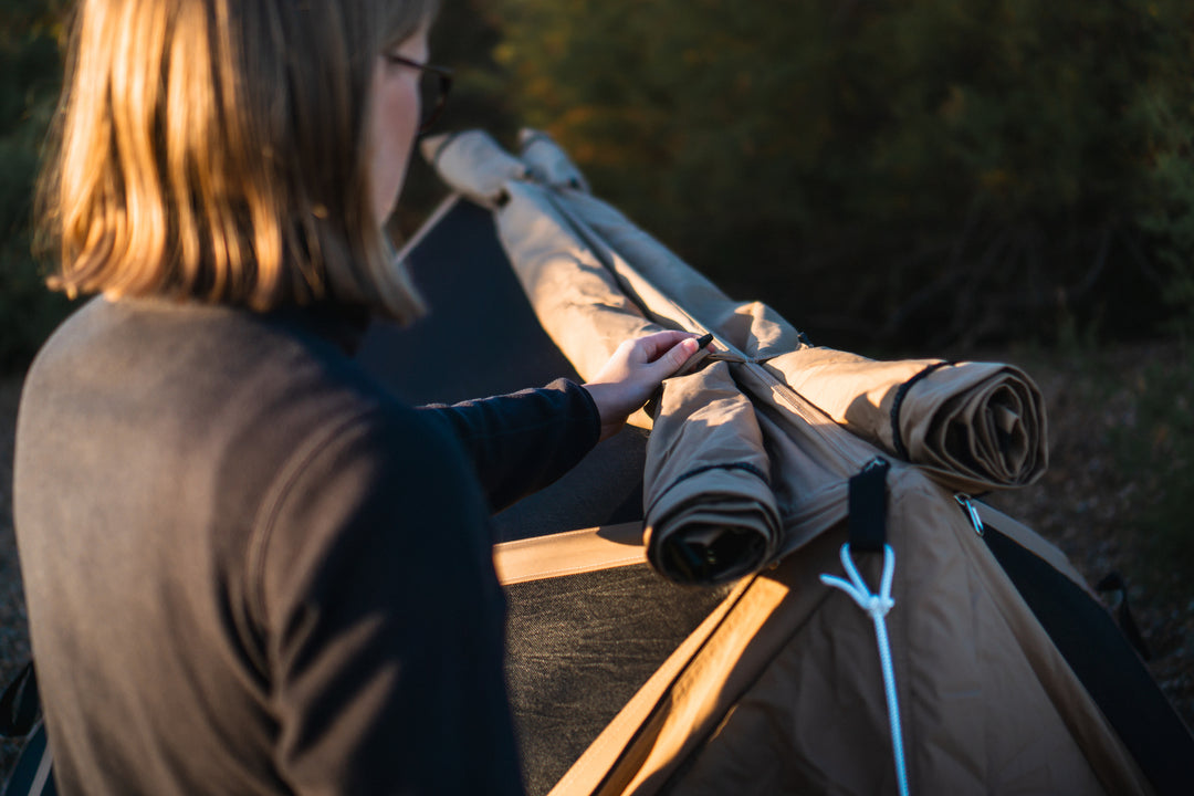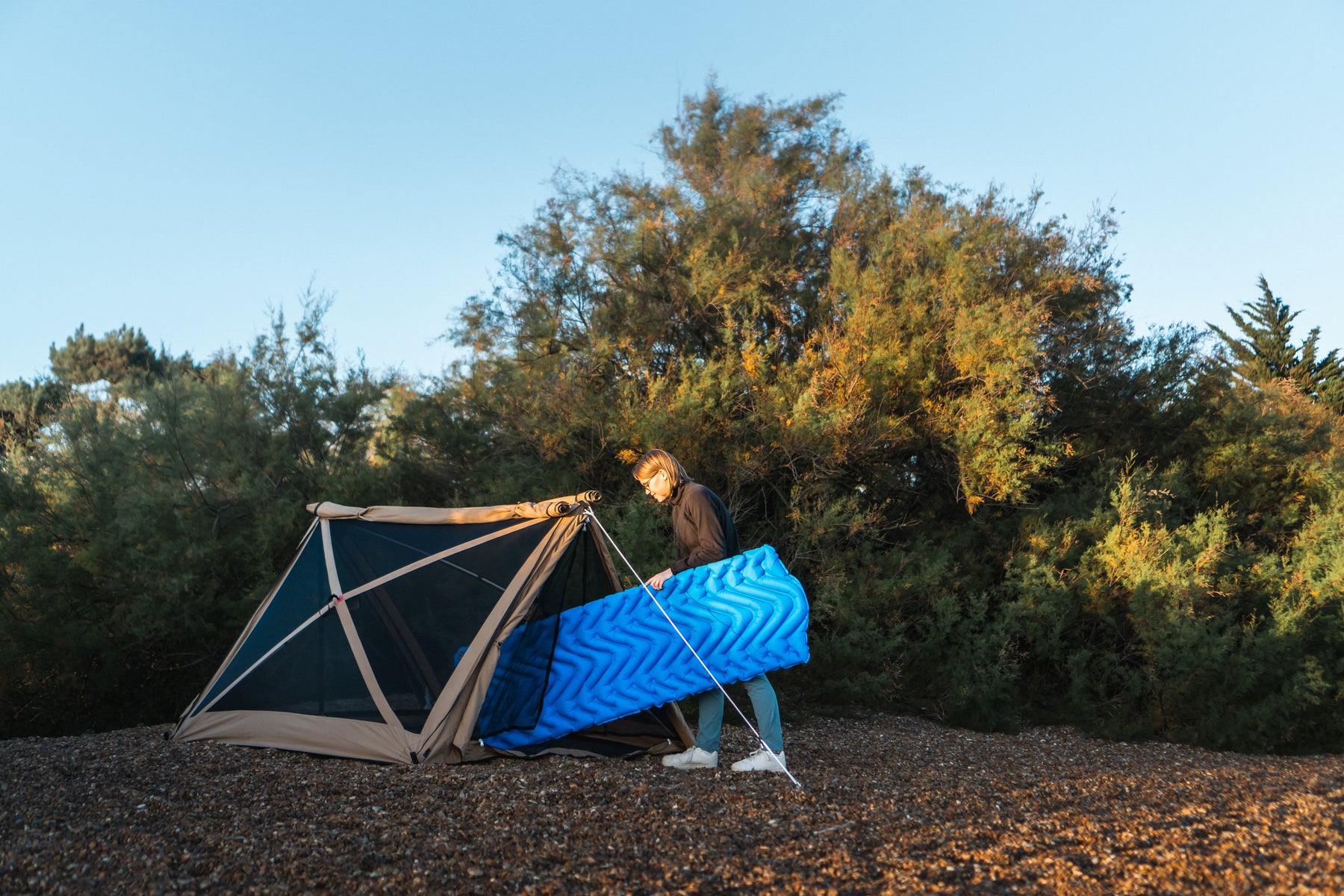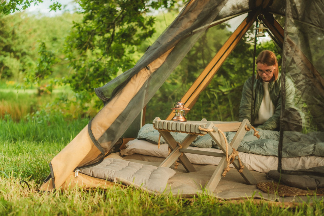 360° panoramic view: unzip the canvas completely to gaze at the stars all night long, while integrated mosquito screens keep insects outside where they belong. The 400 gr/m² PVC groundsheet is both comfortable and 100% waterproof, keeping you dry even in heavy rain.