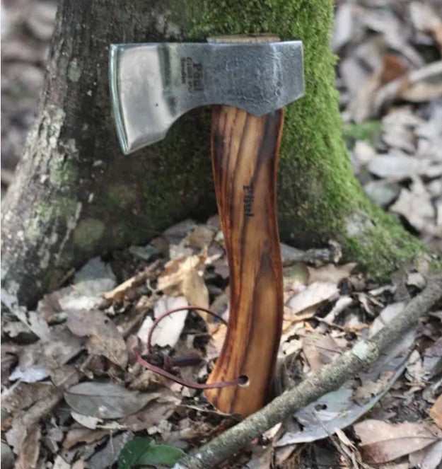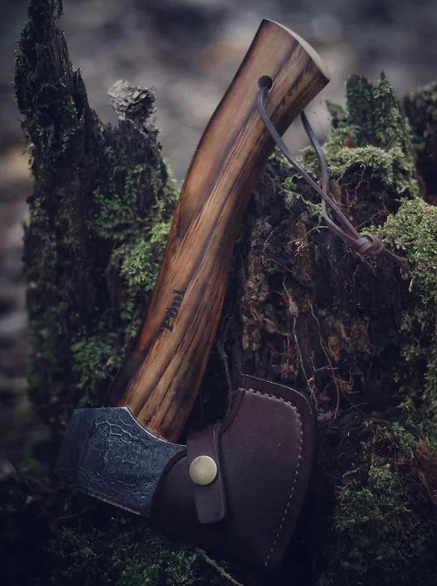 The Pöul mini axe is the perfect tool for outdoor enthusiasts. The axe head is made of high-carbon steel, making it perfect for chopping wood and cutting through branches. The handle is crafted hickory, a weather-resistant wood, and coated with linseed oil to ensure a firm grip, even when wet. It comes with a dark vegetable tanned Finnish leather case to protect the blade and a practical loop which enables carrying in a belt or attaching to a backpack.